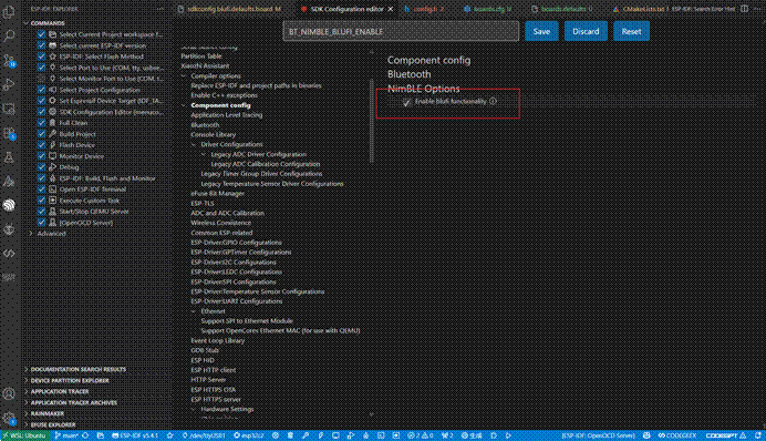 - 搜索BT_NIMBLE_BLUFI_ENABLE,打开选项Enable blufi functionality