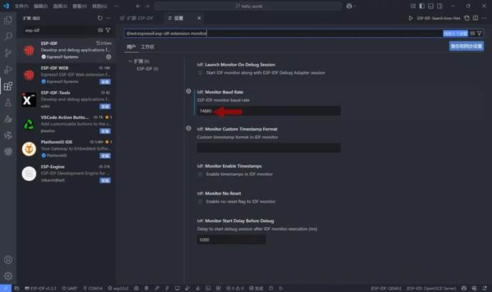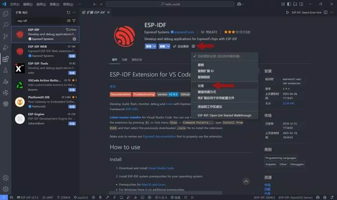 安装完成后,从`ESP-IDF`扩展的安装界面,先设置图标,再选择设置: