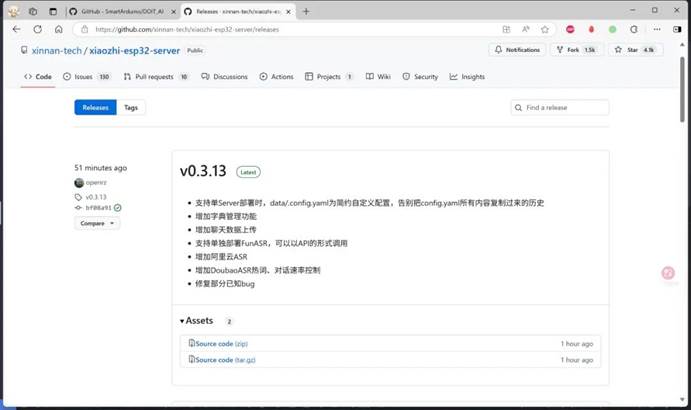从https://github.com/xinnan-tech/xiaozhi-esp32-server/releases 可以下载最新发布的开源后端服务的源码: