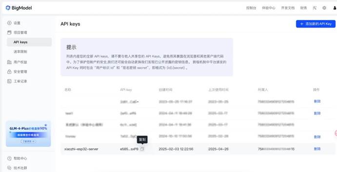 默认的LLM使用的是ChatGLM,去ChatGLM的官网https://bigmodel.cn/注册登录,然后添加新的Api Key,就可以免费使用: