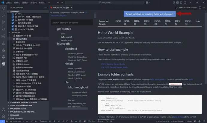 点击右边导航栏的乐鑫圆形图标,在`Advanced`中点击`展示示例项目`,在列出的项目中,选择`hello_world`,然后点击`Select location for hello_world project`: