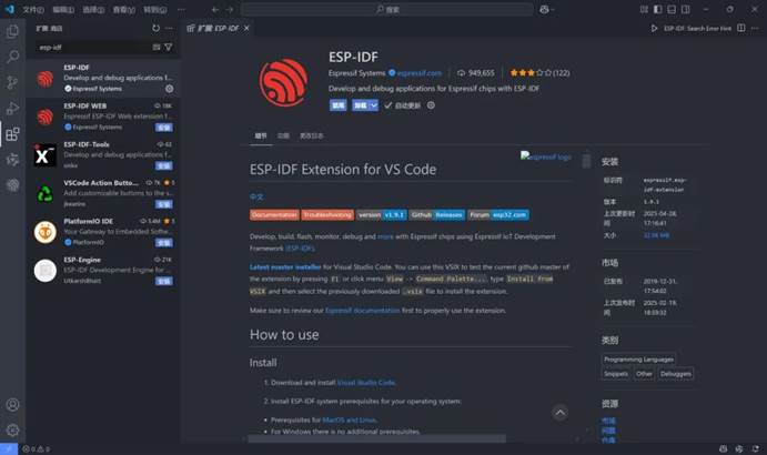 安装后,打开VSCode,点击右侧导航栏的3+1方块图标,进入扩展安装,然后搜索esp-idf安装即可: