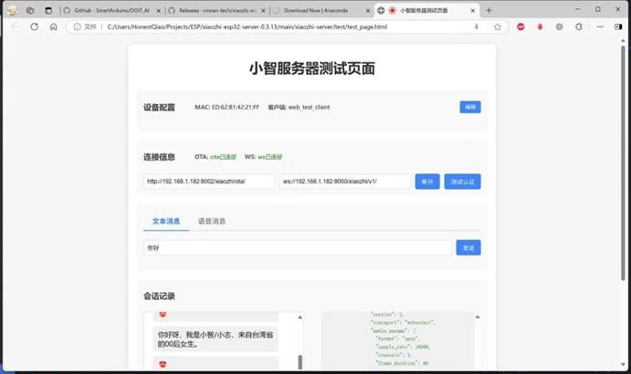 在测试界面中,填入上一步最终得到的OTA接口地址和WebSocket接口地址,就可以连接测试: