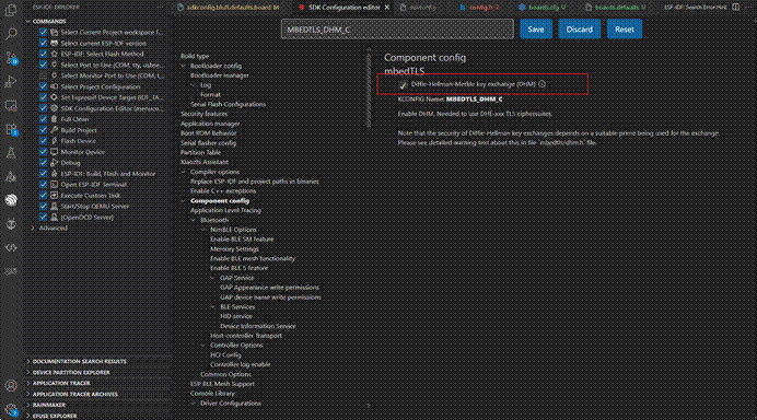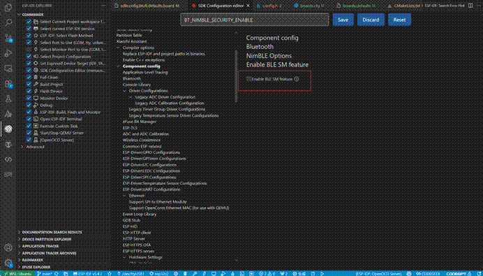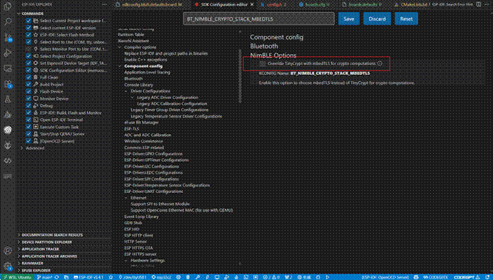 - 搜索BT_NIMBLE_CRYPTO_STACK_MBEDTLS,把Override TinyCrypt with mbedTLS for crypto computations选项关闭