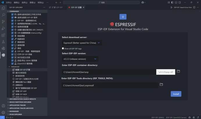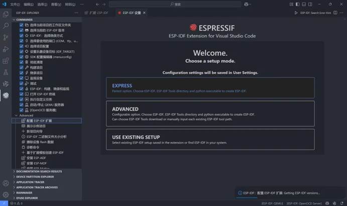 安装完ESP-IDF扩展后,点击右边导航栏的乐鑫圆形图标,在`Advanced`中点击`配置ESP-IDF扩展`,然后选择`EXPRESS`进入安装配置: