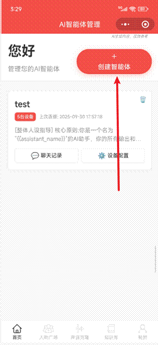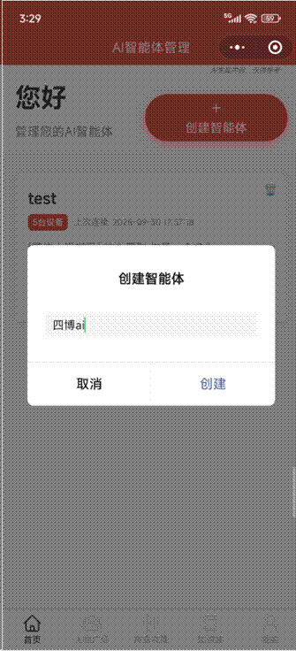 进入小程序后,首先创建一个新的智能体,智能体的名称可以自行设置,如下图所示: