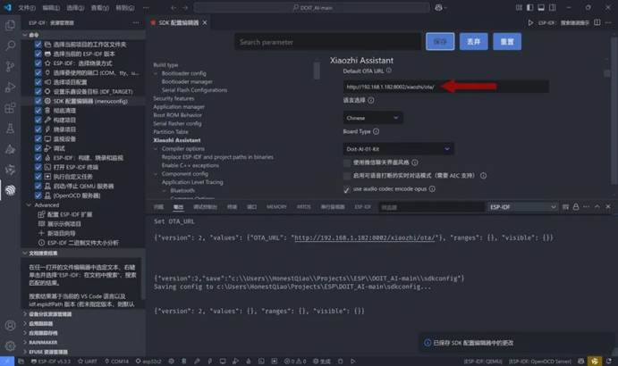 使用VSCode打开设备端DOIT_AI源码,参考之前`设置编译参数`,通过`SDK配置编辑器(menuconfig)`,设置OTA地址: