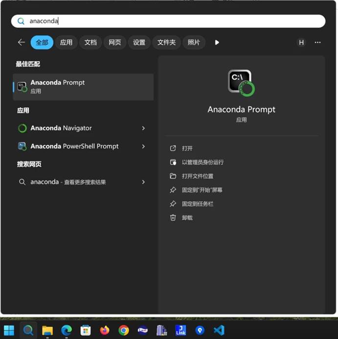 安装完成后,搜索`Anaconda`,打开`Anaconda Prompt`: