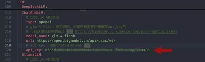 将ChatGLMLLM的api_key,设置为前面获取的ChatGLM的apikey即可。