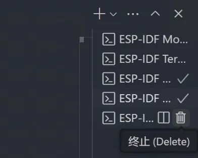 在进行下一步操作之前,需要点击上述信息输出界面右则各任务输出窗口的`回收站图标`终止任务,否则后续操作中,烧录和监视串口会有问题。