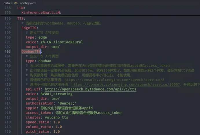 下面的演示中,服务端配置中,使用了DoubaoLLM和DoubaoTTS: