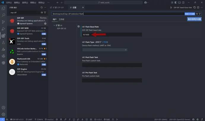 在设置界面中,先搜索`flash`,设置烧录的波特率为921600: