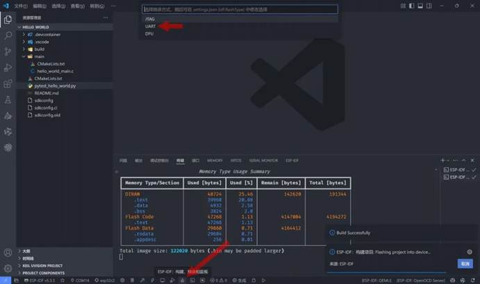操作完成后,再点击底部的`ESP-IDF:构建、烧录和监视`图标,并在顶部弹出列表中选择`UART`: