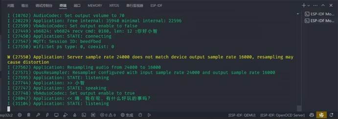 待输出上面信息后,重新插拔`AI-01开发板`的Tyep-C数据线,`AI-01开发板`将重新上电运行前面烧录的程序,并输出小智AI运行的信息,并听到嘟的一声响: