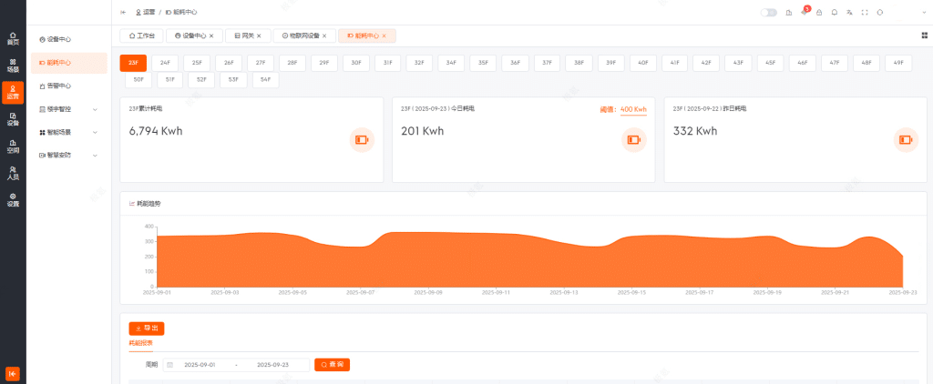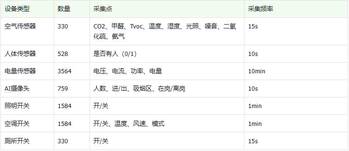 在某大厦智能化项目中,共有 30 层楼宇,部署近万台传感器设备,涵盖人体感应、空气质量、厕位、烟雾、电量、水浸等多种类型。所有传感器均以秒级频率上报数据,日均数据量高达数千万条,对系统的数据采集与处理能力提出了极高要求。