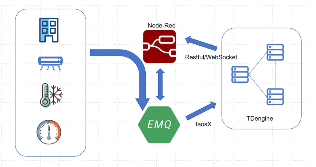- EMQ 再通过 Restful / WebSocket 接口从 TDengine TSDB 获取所需数据,为上层业务应用与可视化系统提供实时访问能力。