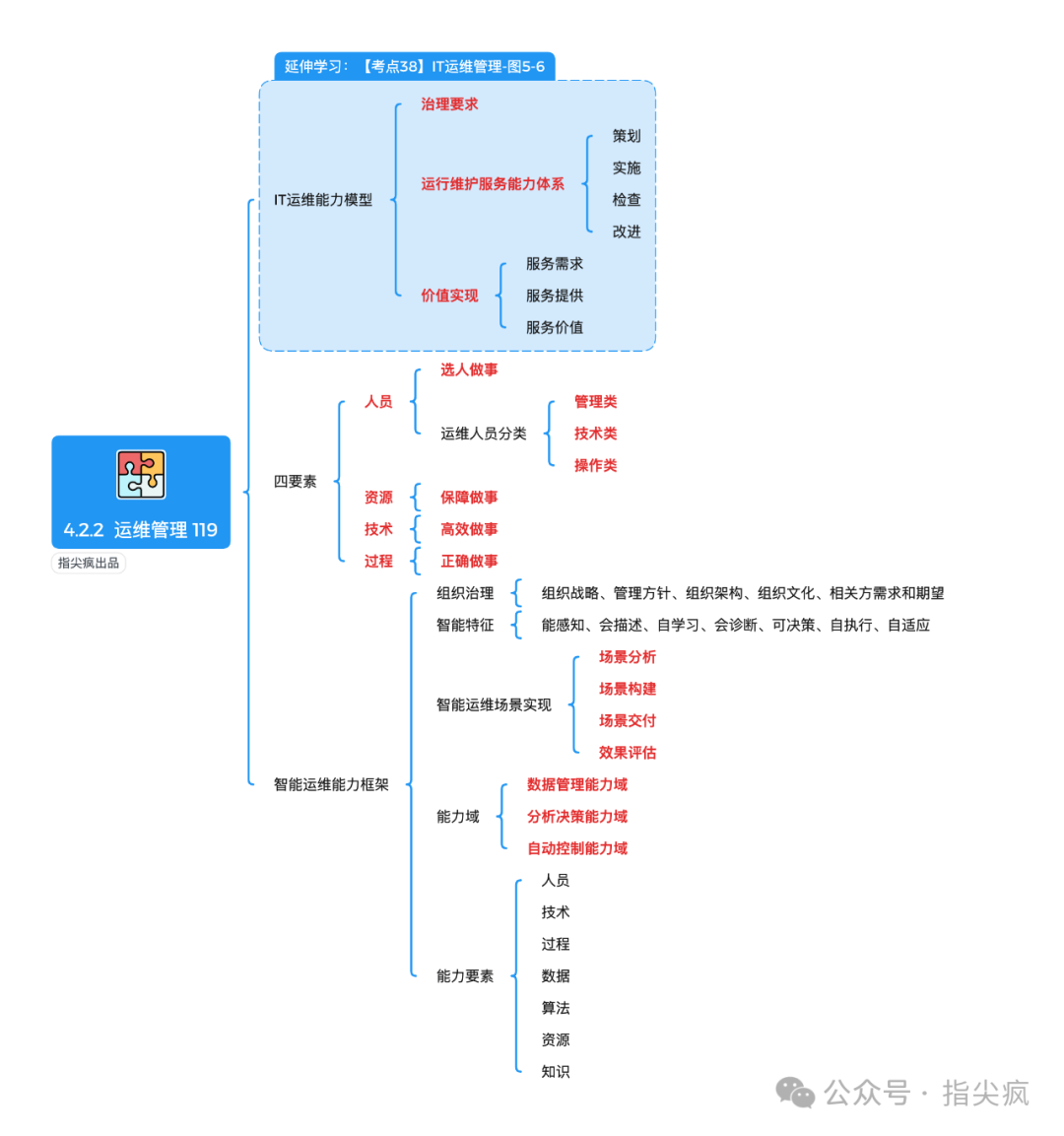 有了顶层框架,接下来就是把管理落地的运维管理部分。这是考点最密集的板块,本质是用标准化的方式管运维:先通过性能、故障、配置等运行监控掌握系统状态,再靠事件、问题、变更、发布这些 IT 服务流程解决实际问题,最后依托 ITSS 的服务全生命周期(从规划设计到部署实施、服务运营再到持续改进),把零散的运维工作变成体系化的服务,让管理能力真正落到实处。