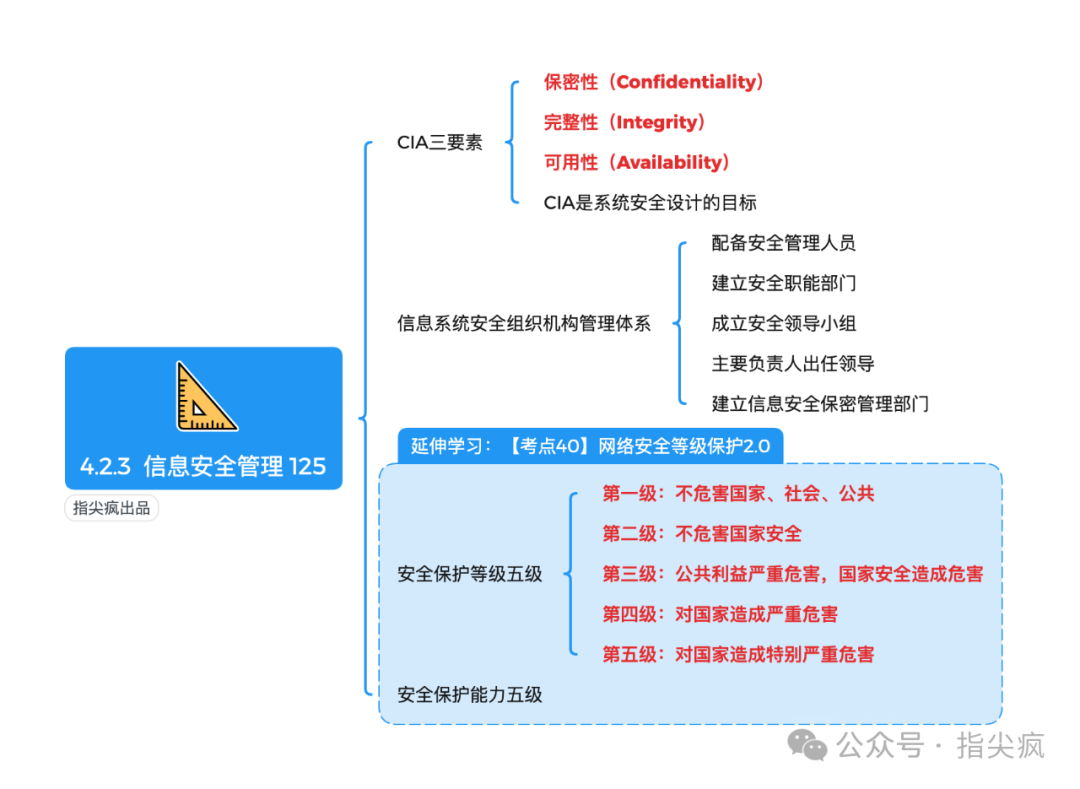 最后是整个体系的底线防护,也就是信息安全管理。 CIA 三性(保密性、完整性、可用性)定下了安全的核心目标,搭起了完整的防护体系,明确安全管理员、相关部门等角色的责任分工,这部分是信息系统稳定运行的兜底保障。