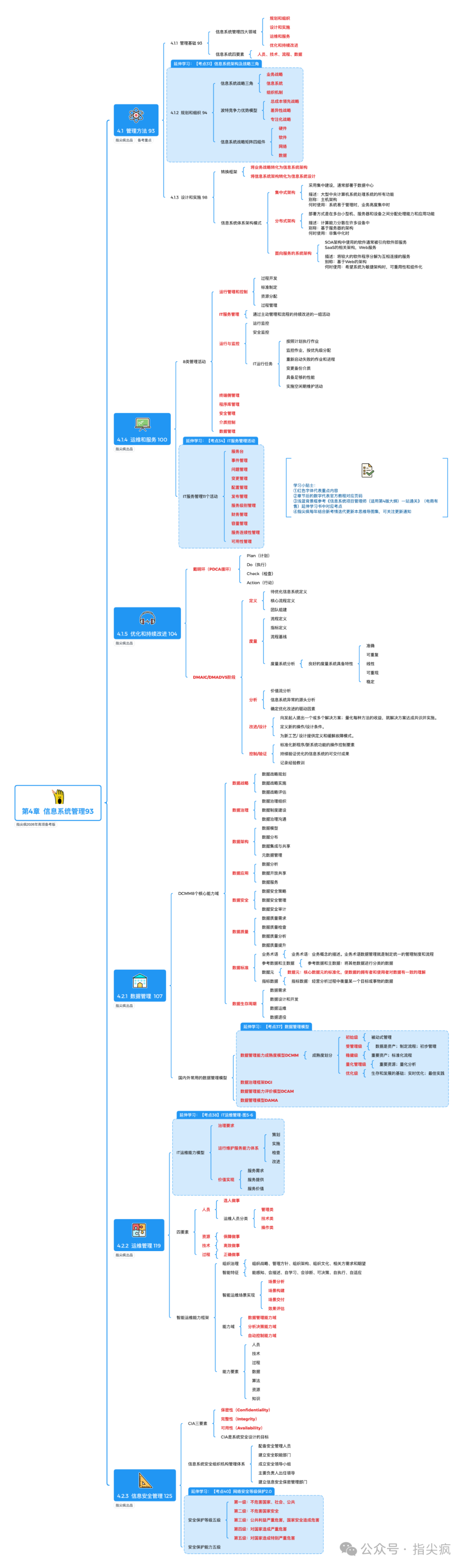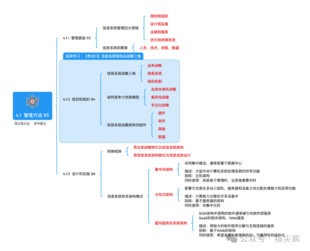 今天要拆解的是软考高项中的第4章信息系统管理。这一章考点多且关联紧密,信息系统管理一共分5个模块。这一章的核心,其实是围绕 "怎么把信息系统管好、用好" 展开。先从管理方法说起,这里明确了集中式、分布式及 SOA、微服务等架构的不同适用场景,比如集中式更适合业务集中、资源需要共享的场景,分布式则对应业务分散的需求,这些内容是给后续的管理定好了底层逻辑。