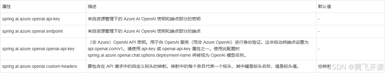 前缀 spring.ai.azure.openai 是用于配置连接到 Azure OpenAI 的属性前缀。