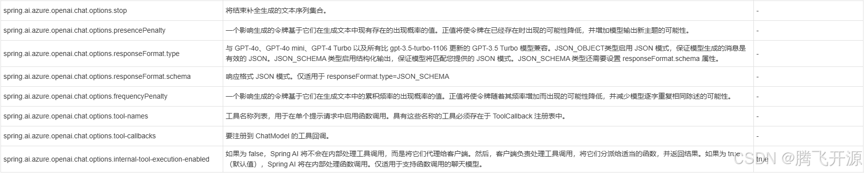 AzureOpenAiChatOptions 提供了模型配置,例如要使用的模型、温度、频率惩罚等。