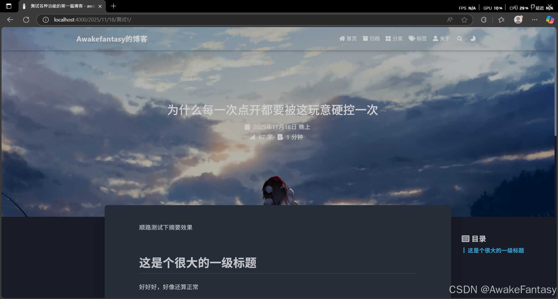 上文都写着问题一阶段了,那当然有问题二阶段😭,我将一阶段的问题整理后回复给了提出那个issue的朋友,没想到没过几天那位朋友就发现了新的问题:换成最新的文件之后所有的页面标题都变成了随机显示的文字了😭。效果如下,这篇博客是我用来测试博客功能的那篇博客,可以看到中间应该显示标题的地方显示的是"为什么每一次点开都要被这玩意硬控一次"。