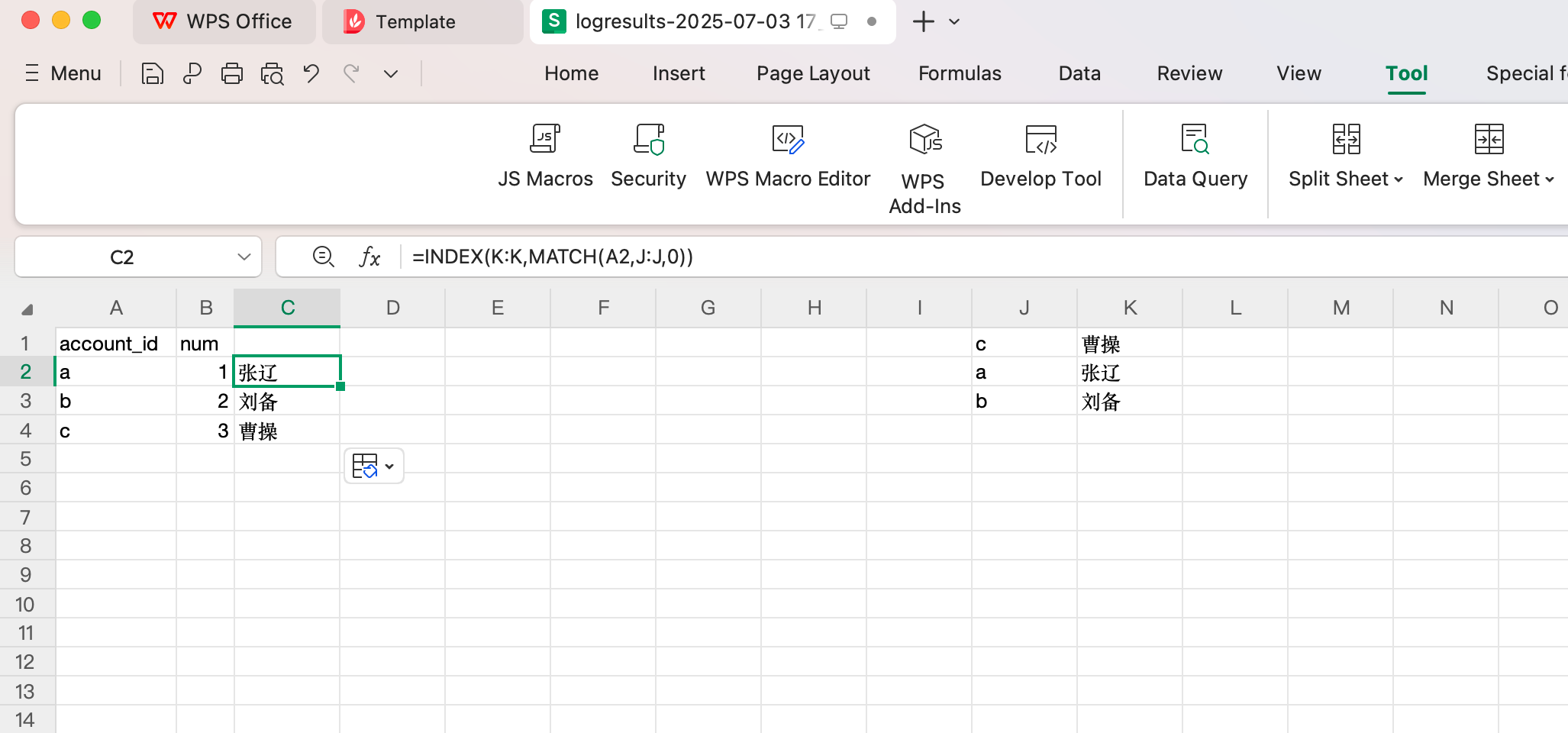 =IFERROR(INDEX(K:K, MATCH(A2, J:J, 0)), "未找到") -