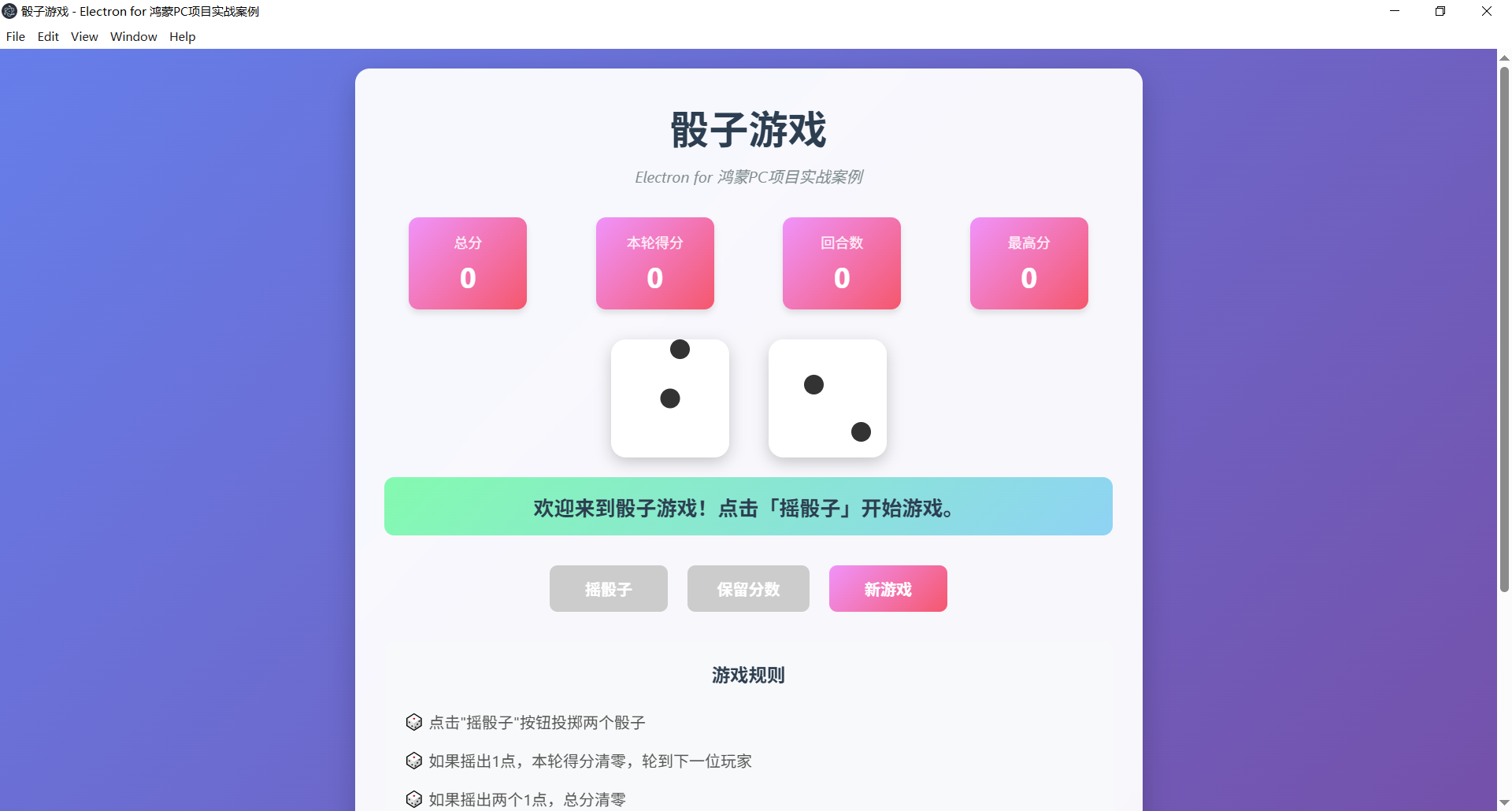 本项目是一个基于Electron框架开发的骰子游戏应用,专为鸿蒙PC平台设计。这是一个经典的两人骰子游戏,玩家通过摇骰子累积分数,目标是先达到100分获胜。游戏包含完整的分数管理、玩家切换和特殊规则处理功能。