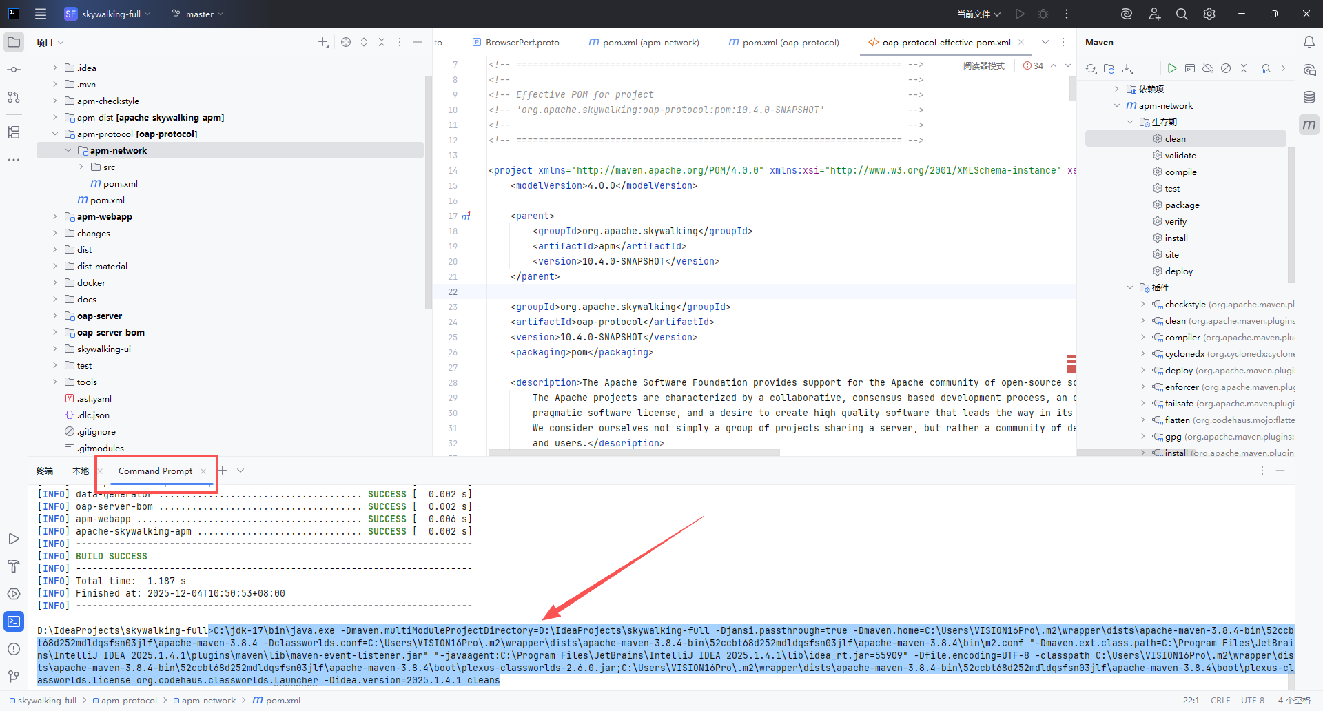 C:\jdk-17\bin\java.exe -Dmaven.multiModuleProjectDirectory=D:\IdeaProjects\skywalking-full -Djansi.passthrough=true -Dmaven.home=C:\Users\VISION16Pro\.m2\wrapper\dists\apache-maven-3.8.4-bin\52ccbt68d252mdldqsfsn03jlf\apache-maven-3.8.4 -Dclassworlds.conf=C:\Users\VISION16Pro\.m2\wrapper\dists\apache-maven-3.8.4-bin\52ccbt68d252mdldqsfsn03jlf\apache-maven-3.8.4\bin\m2.conf "-Dmaven.ext.class.path=C:\Program Files\JetBrains\IntelliJ IDEA 2025.1.4.1\plugins\maven\lib\maven-event-listener.jar" "-javaagent:C:\Program Files\JetBrains\IntelliJ IDEA 2025.1.4.1\lib\idea_rt.jar=55909" -Dfile.encoding=UTF-8 -classpath C:\Users\VISION16Pro\.m2\wrapper\dists\apache-maven-3.8.4-bin\52ccbt68d252mdldqsfsn03jlf\apache-maven-3.8.4\boot\plexus-classworlds-2.6.0.jar;C:\Users\VISION16Pro\.m2\wrapper\dists\apache-maven-3.8.4-bin\52ccbt68d252mdldqsfsn03jlf\apache-maven-3.8.4\boot\plexus-classworlds.license org.codehaus.classworlds.Launcher -Didea.version=2025.1.4.1 clean