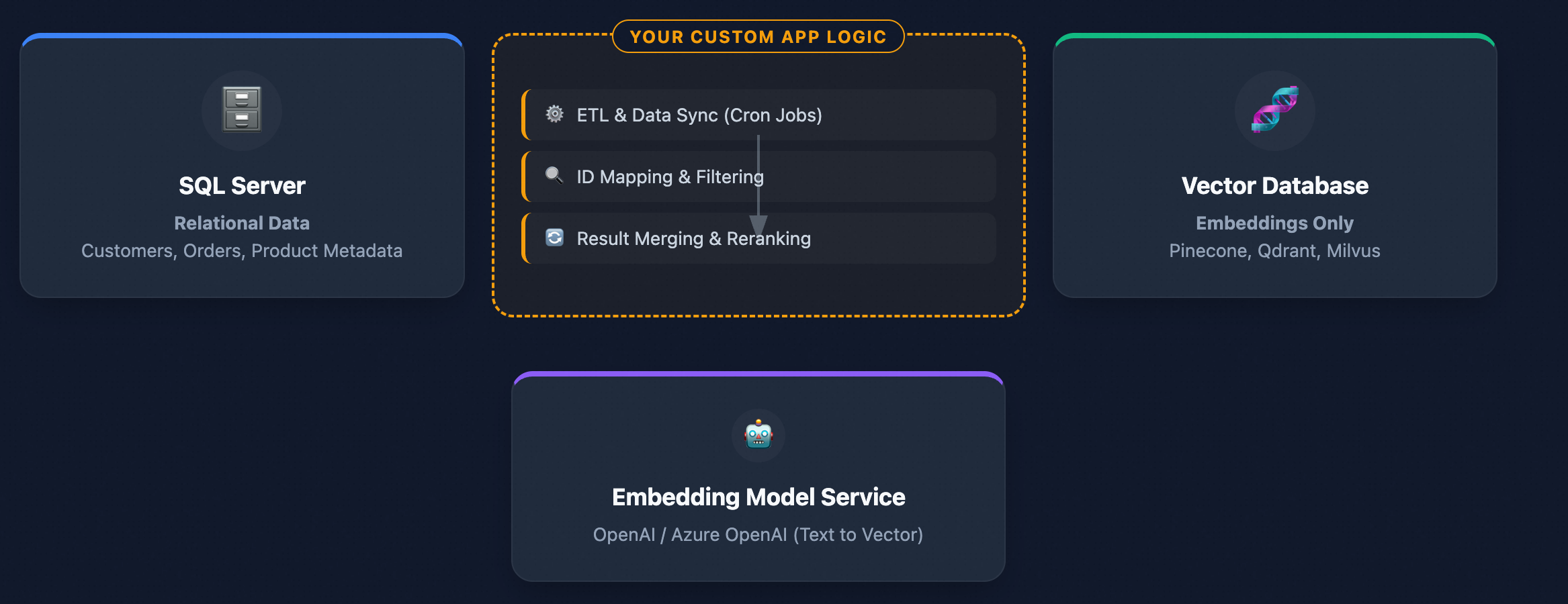 该图中可以看到,做一个简单的RAG程序,需要从SQL Server中捞出数据,调用外部模型进行文本切块,向量嵌入,然后将数据再存储到外部的向量数据库中,例如Milvus