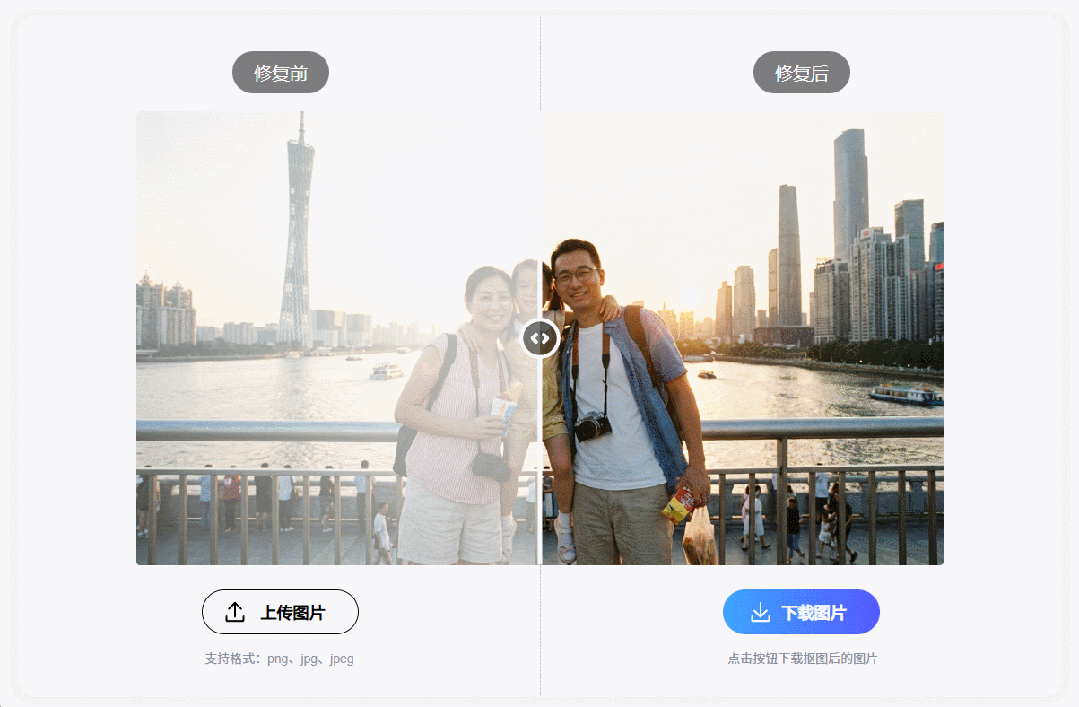 今天和大家分享AI图片变清晰的原型模版,可以上传本地图片和模拟图片变清晰的效果,左右拖动可以查看修复前后的图片。具体效果你们可以观看下面的视频或打开原型预览地址亲自体验