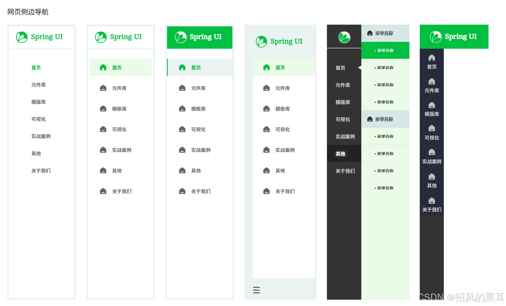 Spring UI同样提供了多个优秀的侧边导航设计案例。这些案例中的侧边导航不仅层级分明、图标美观,而且通过合理的交互设计,使得用户能够轻松地在不同页面之间切换。同时,侧边导航与页面内容的布局也十分协调,为用户提供了良好的阅读体验。