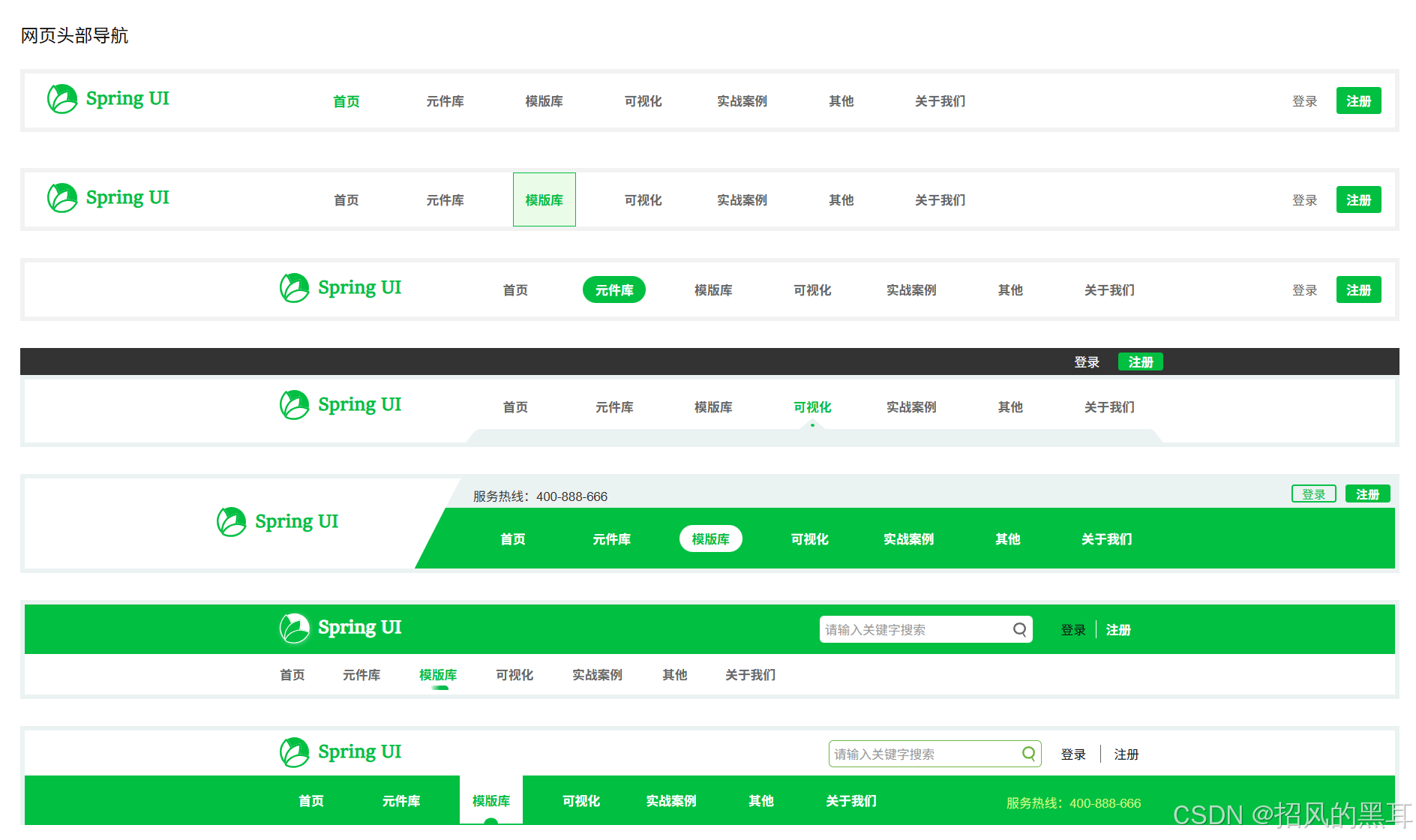 在Spring UI的案例中,我们可以看到多个精心设计的头部导航实例。这些导航栏不仅结构清晰,而且样式美观,通过绿色和白色的搭配,营造出一种清新、专业的视觉效果。同时,导航栏上的链接都设置了合理的点击区域和交互效果,确保用户能够轻松访问网站的不同部分。