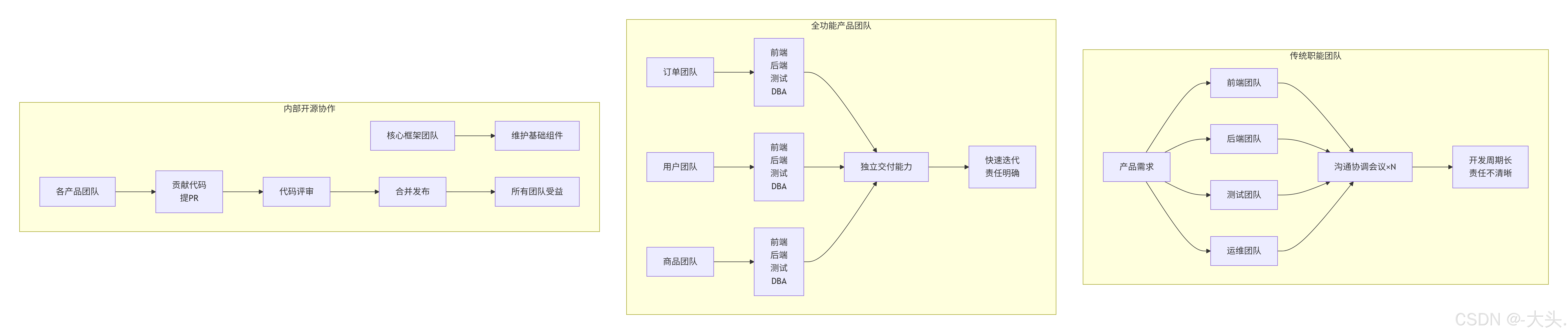 结果:一个需求需要跨4个团队协作,沟通成本极高,上线速度反而变慢。