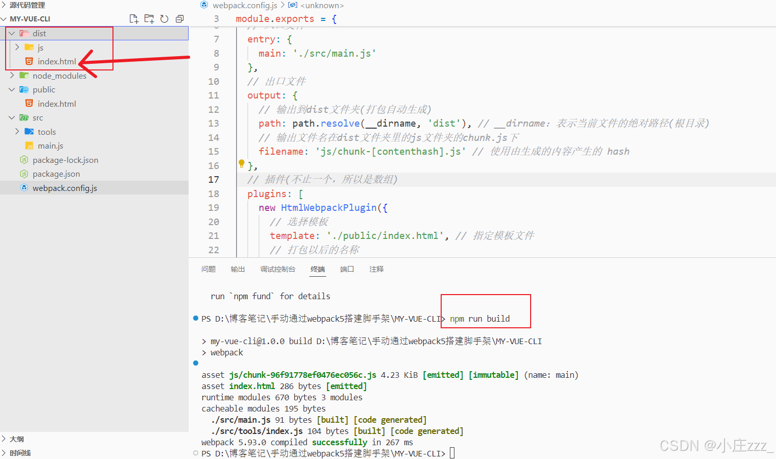 可以发现对比传统脚手架的npm run build,我们自己搭建的脚手架并没有在dist文件夹里生成index.html文件,现在我们来试试吧!