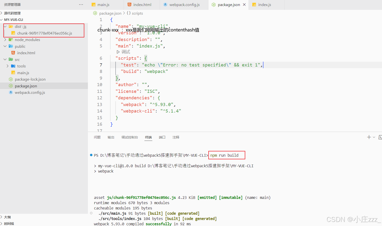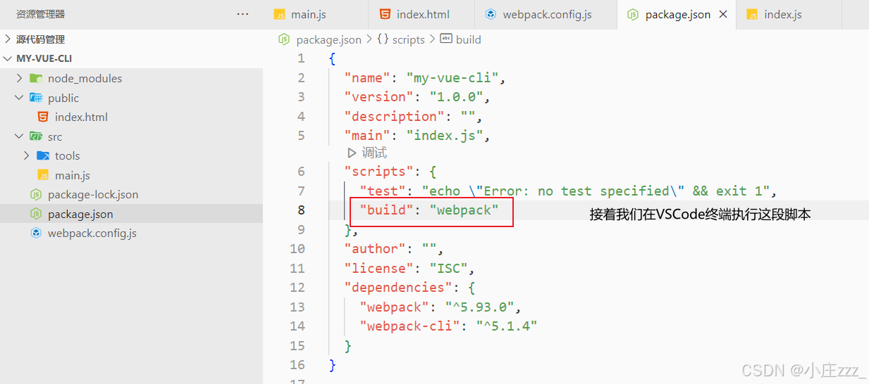 现在,我们已经配置好了webpack。在package.json中,我们创建一个运行webpack命令构建脚本: