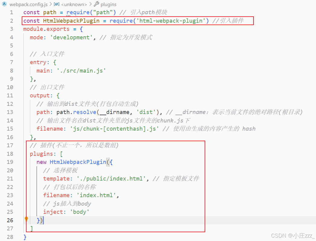 - Plugin(插件):插件用于扩展Webpack的功能。它可以在打包的不同阶段执行特定的任务。例如,可以使用插件来压缩代码、拆分代码、生成HTML文件等。插件通过在Webpack配置中引入并实例化,然后将其添加到plugins数组中。