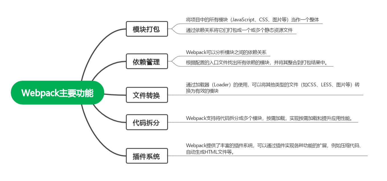 Webpack是一个前端模块打包工具 。它可以将多个模块按照依赖关系进行静态分析,并生成一个或多个打包后的文件。Webpack的主要功能包括:
