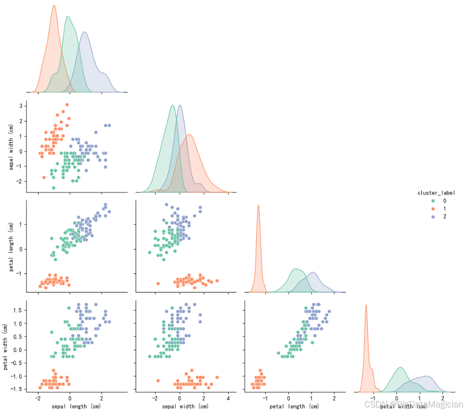 - 散点图区域(下三角):不同簇的样本在特征组合下呈现明显的聚集性------以"花瓣长度-花瓣宽度"组合为例,橙色样本(簇1)集中在左下角、青色样本(簇0)集中在中间区域、蓝色样本(簇2)集中在右上角,三类几乎无重叠,体现了簇间的强区分度;