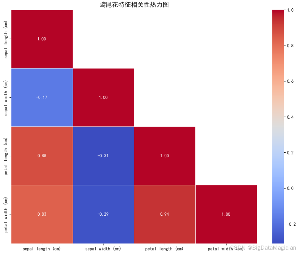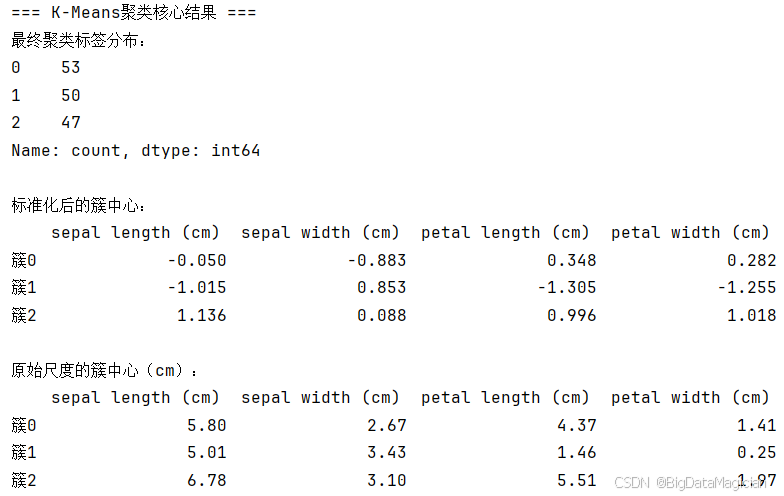 这一可视化结果直观印证了K-Means聚类的有效性,样本按形态特征自然划分为三个独立群体,与鸢尾花的实际品种分类高度契合。