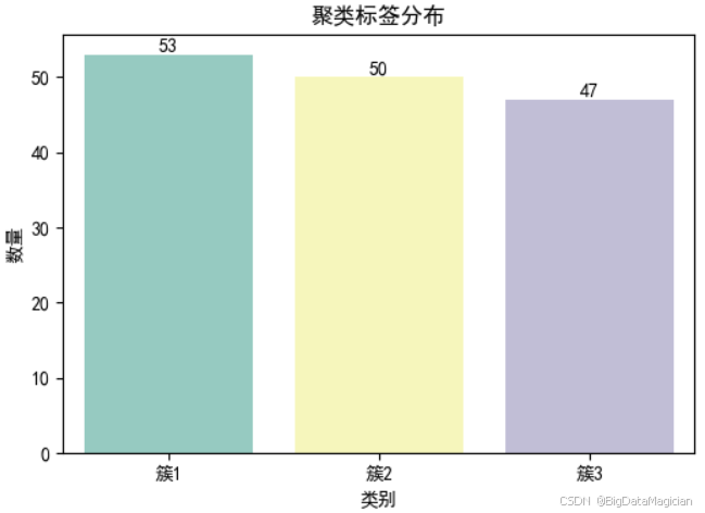 聚类标签分布可反映各簇的样本数量均衡性,是评估聚类结果合理性的基础指标之一。本次通过柱状图展示3个簇的样本数量分布。