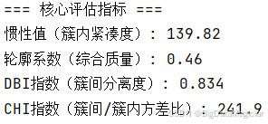 - 惯性值(139.82):代表簇内所有样本到其簇中心的距离平方和,该值处于合理区间(结合k=3的肘部法则结果),说明簇内样本的紧凑度较好;