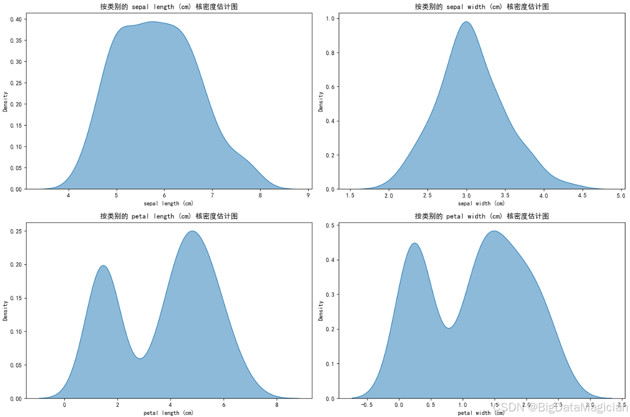 - 核密度图区域(对角线):各簇的单特征分布边界清晰(如花瓣长度的核密度图呈现三个独立峰值),与聚类前的单特征分布规律一致,验证了簇内样本的紧凑性。