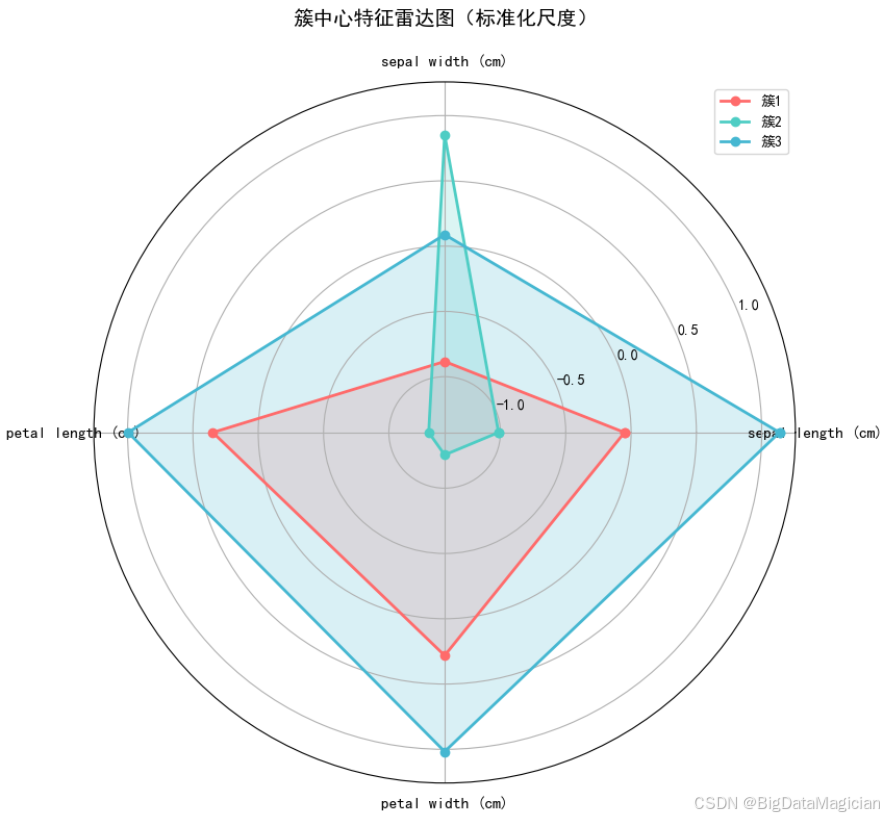 - 簇1(红色):各特征维度的径向距离均介于簇2与簇3之间,呈现"中等尺寸花部"的均衡轮廓。
