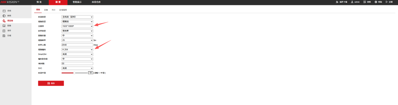 2)设备实际配置:H.264编码格式+1K分辨率