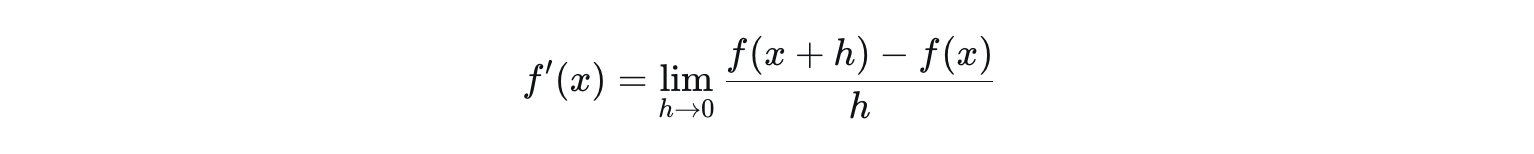 数学定义(极限定义):对于函数 y=f(x)y=f(x),在点 xx 处的导数定义为: