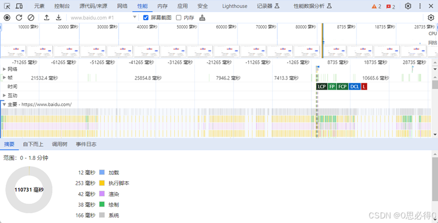 此时,会看到一个包含了各种性能数据的时间轴图表。这个时间轴图表将显示页面加载期间的各种事件,如JavaScript执行、网络请求、渲染等。 - 分析性能数据