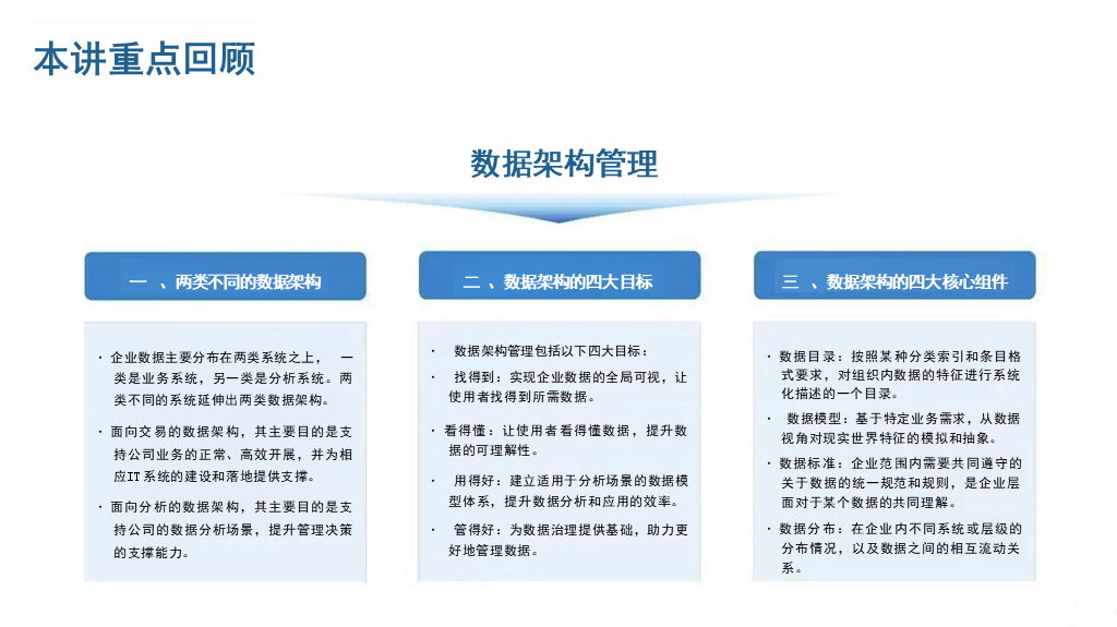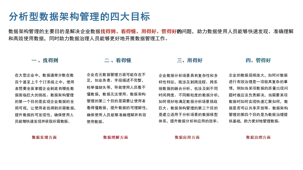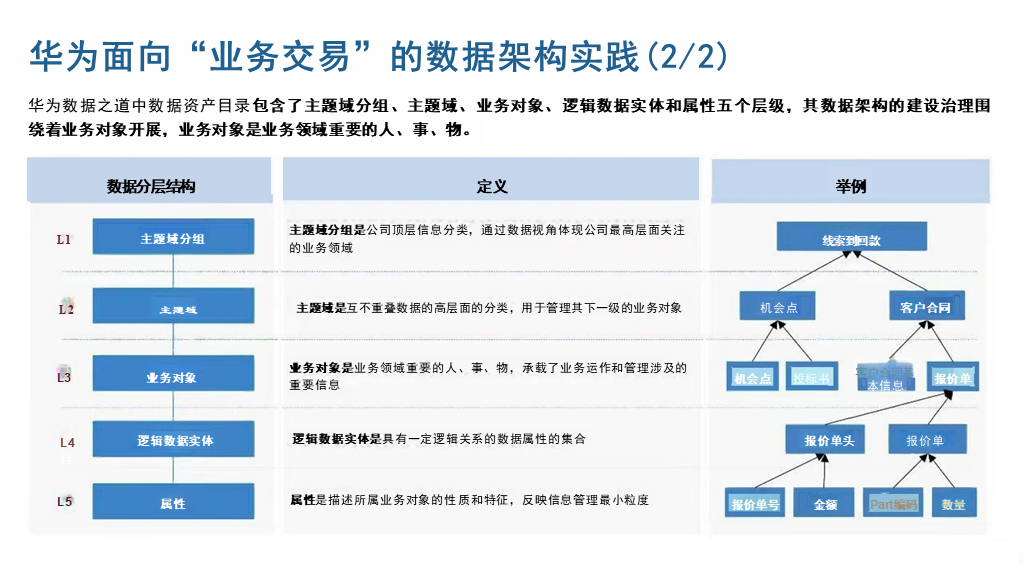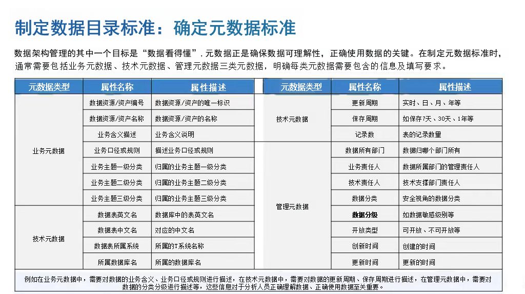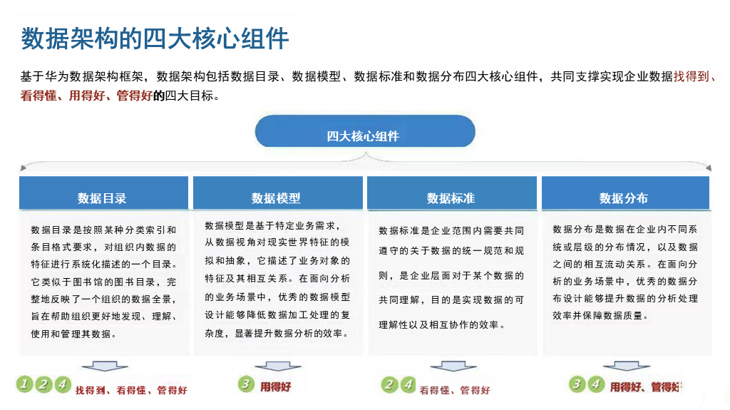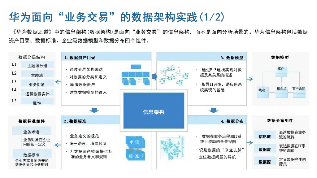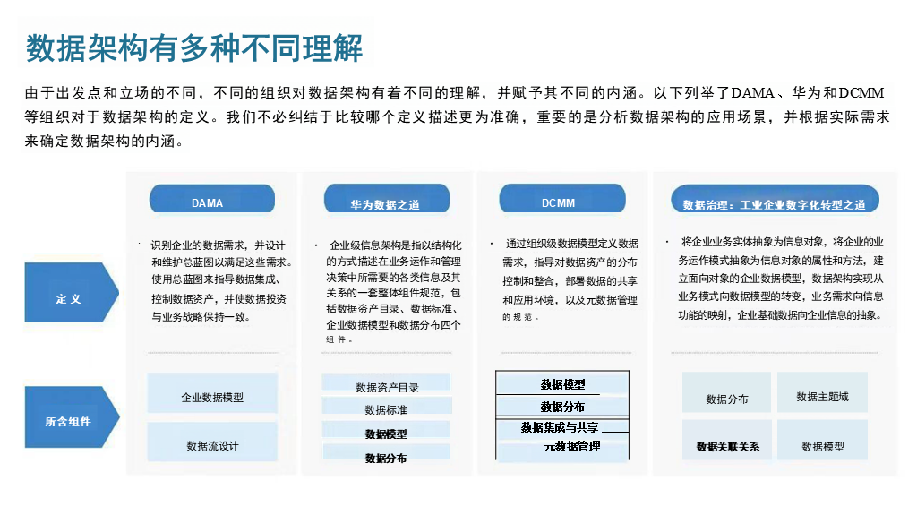 本文档为《数据架构管理培训》课件,适配企业 IT 部门(数据架构设计 / 数据建模岗、数据仓库 / 数据中台运维岗)、数据管理部门(数据治理 / 元数据管理岗)、业务部门(数据分析 / 数据应用岗),以及数据架构咨询机构、高校数据管理相关专业教研团队。核心围绕数据架构管理全体系,以 "理论 + 实践" 为框架:先解析数据架构定义(DAMA、华为、DCMM 等组织视角)与两类场景架构(面向交易架构支撑业务流程,面向分析架构服务决策),明确 "找得到、看得懂、用得好、管得好" 四大目标;再拆解四大核心组件,含数据目录(建设标准 / 编制流程 / 运营机制,区分资源 / 资产 / 开放目录)、数据模型(实体 / 关系 / 属性 / 域组件,概念 - 逻辑 - 物理三层模型,星型 / 雪花模型等方法)、数据标准(命名 / 定义 / 编码 / 元数据标准)、数据分布(归集 - 整合 - 汇总 - 应用四层架构及各层定位);结合华为实践、电商订单建模等案例,配套元数据维护、数据分类等工具模板,为企业搭建规范数据架构、提升数据管理效率与应用价值提供系统化培训指引。