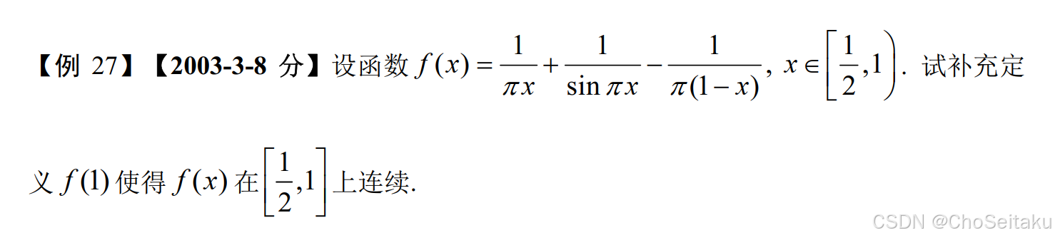 只需令f(1)=1π,即可使f(x)在[12,1]上连续. \text{只需令}f(1) = \frac{1}{\pi},\text{即可使}f(x)\text{在}\left[\frac{1}{2},1\right]\text{上连续.} 只需令f(1)=π1,即可使f(x)在[21,1]上连续.