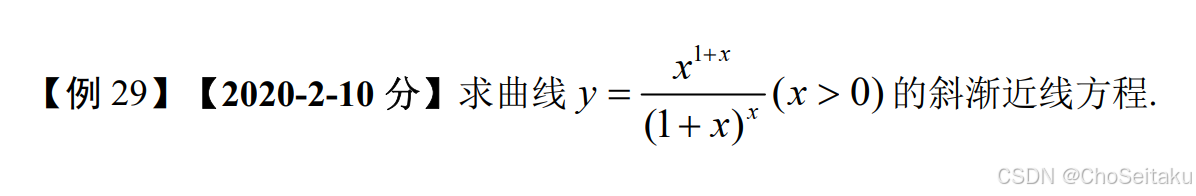 解:k=limx→+∞x1+x(1+x)xx=limx→+∞xx(1+x)x=limx→+∞1(1x+1)x=1eb=limx→+∞(y−kx)=limx→+∞(x1+x(1+x)x−1ex)=? \begin{aligned} &\text{解:}k = \lim_{x \to +\infty} \frac{\frac{x^{1+x}}{(1+x)^x}}{x} = \lim_{x \to +\infty} \frac{x^x}{(1+x)^x} = \lim_{x \to +\infty} \frac{1}{\left( \frac{1}{x}+1 \right)^x} = \frac{1}{e} \\ & \\ &b = \lim_{x \to +\infty} \left( y - kx \right) = \lim_{x \to +\infty} \left( \frac{x^{1+x}}{(1+x)^x} - \frac{1}{e}x \right) =?\quad \end{aligned} 解:k=x→+∞limx(1+x)xx1+x=x→+∞lim(1+x)xxx=x→+∞lim(x1+1)x1=e1b=x→+∞lim(y−kx)=x→+∞lim((1+x)xx1+x−e1x)=?
